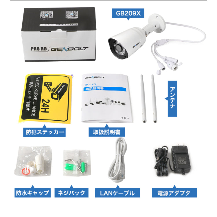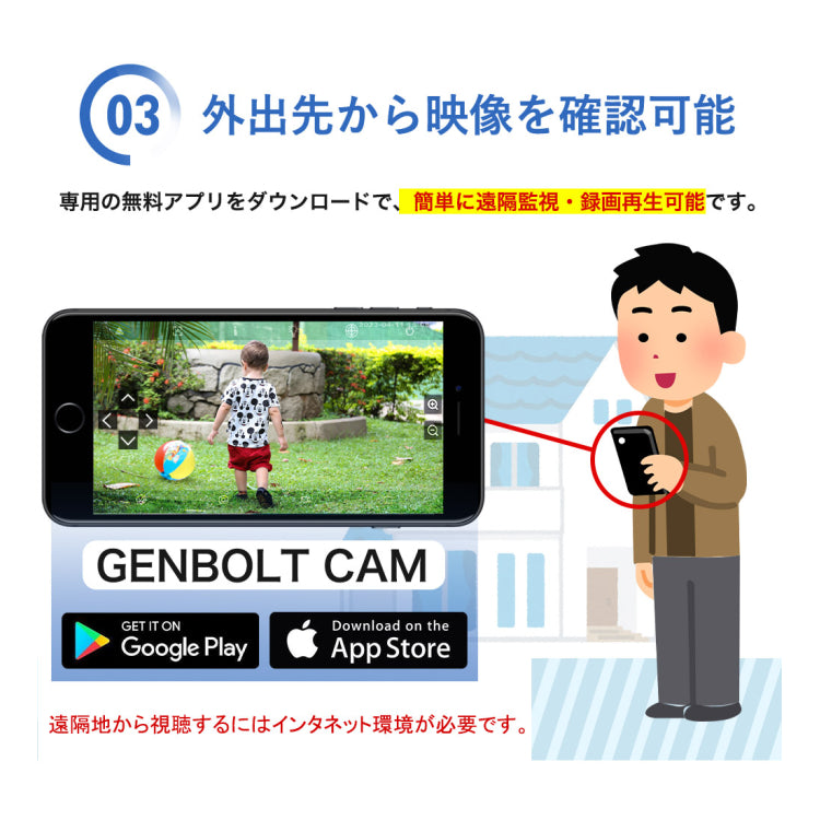 (1)スマホで簡単操作:「GENBOLTCAM」専用アプリで外出先でもリアルタイム視聴、録画再生可能!(海外も可能)