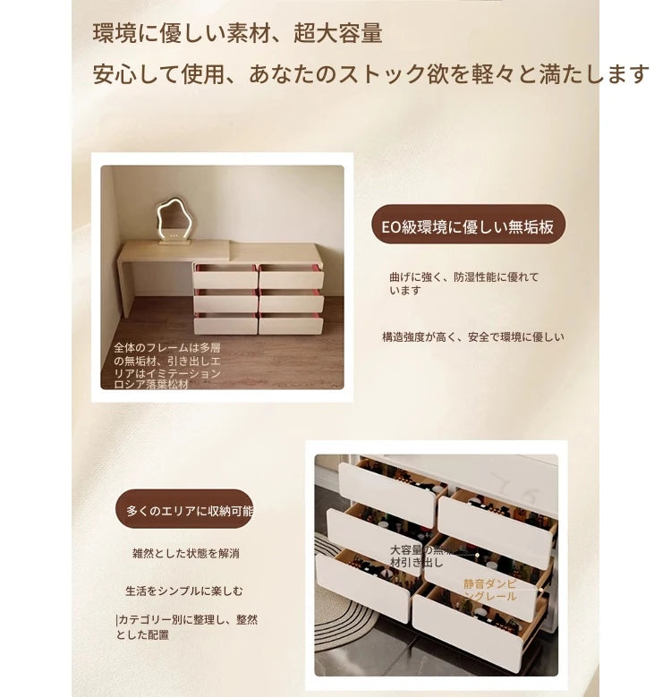 商品特徴 | スタイリッシュなデザインのこの化粧台は、パインと多層板で作られ、どんなインテリアにもマッチします。お部屋を美しく彩るアイテムです。 幅広い収納スペースを提供するこの化粧台は、化粧品やアクセサリーを整理整頓するのに最適。効率的に使えるスペースで、忙しい朝の支度もスムーズに。 自然な風合いのパイン材を使用した化粧台は、心地よい雰囲気を演出。リラックスした時間を過ごすための特別なアイテムとなるでしょう。 耐久性に優れた多層板を使用しているため、長期間にわたって安心して使用できます。毎日のケアをサポートする、頼もしいパートナーです。 シンプルで洗練されたデザインが特徴のこの化粧台は、女性の美しさを引き立てるアイテム。美しいメイクアップを楽しむための必須アイテムです。 コンパクトなサイズでありながら効率的な収納を実現。狭い部屋でも使いやすく、機能性とスタイルを兼ね備えた化粧台です。 |