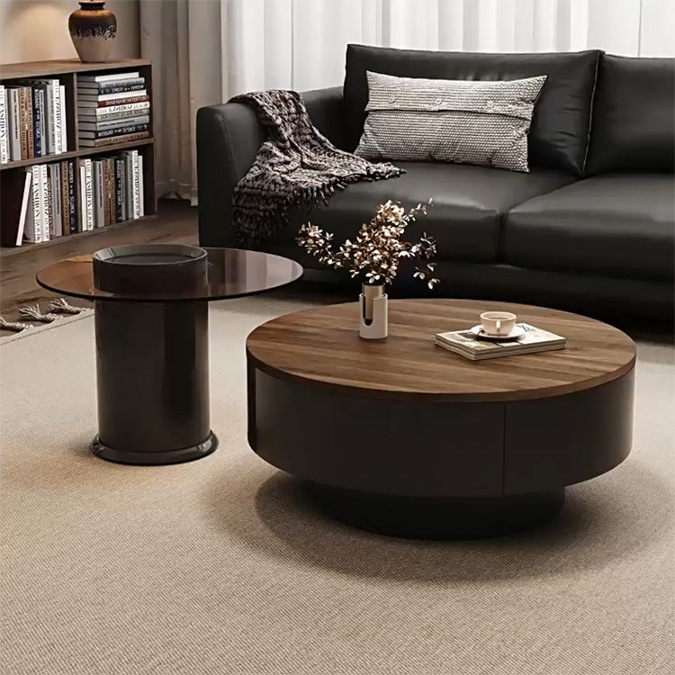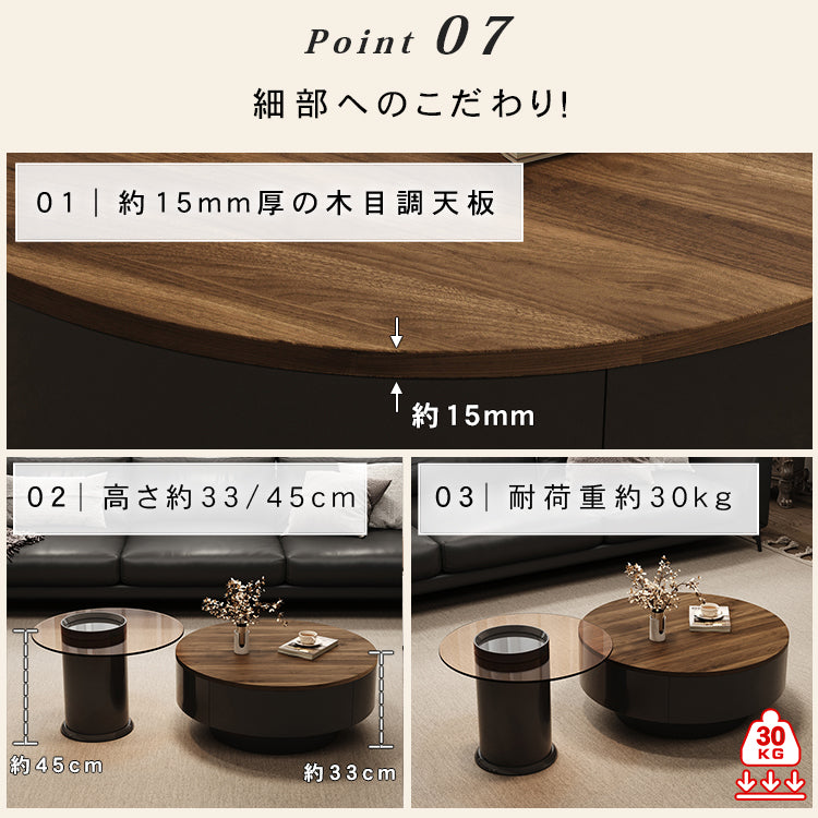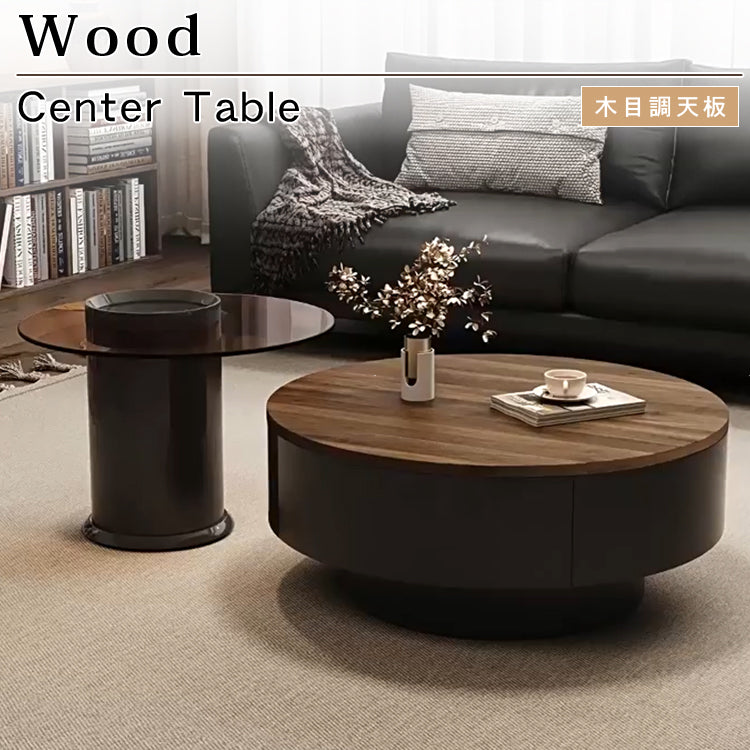 ウォールナット調センターテーブルセット リビング向け 丸型ローテーブル&サイドテーブル 収納一体デザイン htyjj-6571