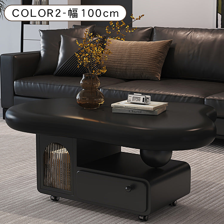 有機フォルムのモダンセンターテーブル リビング用 収納付きローテーブル ブラック×アイボリー htyjj-6584