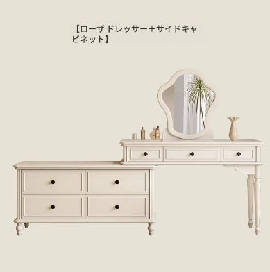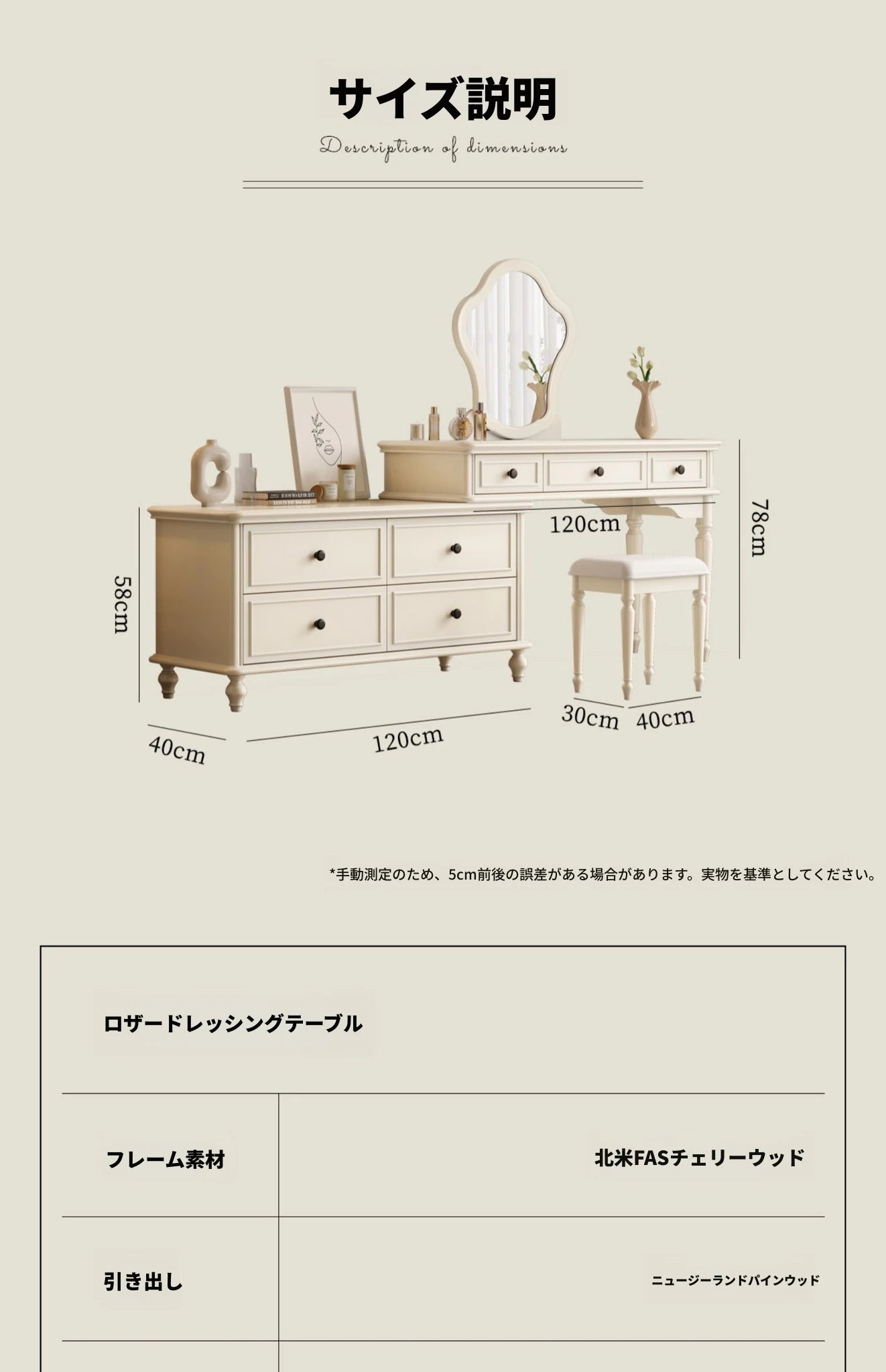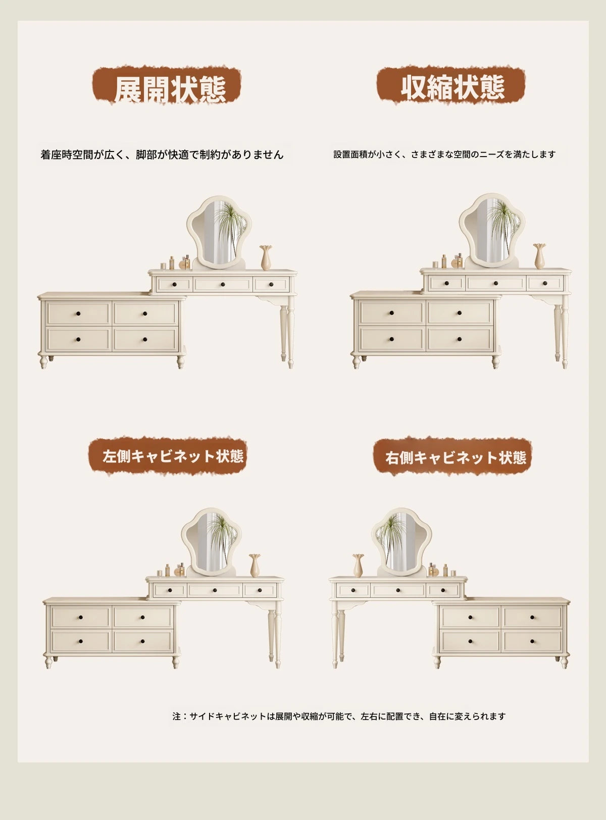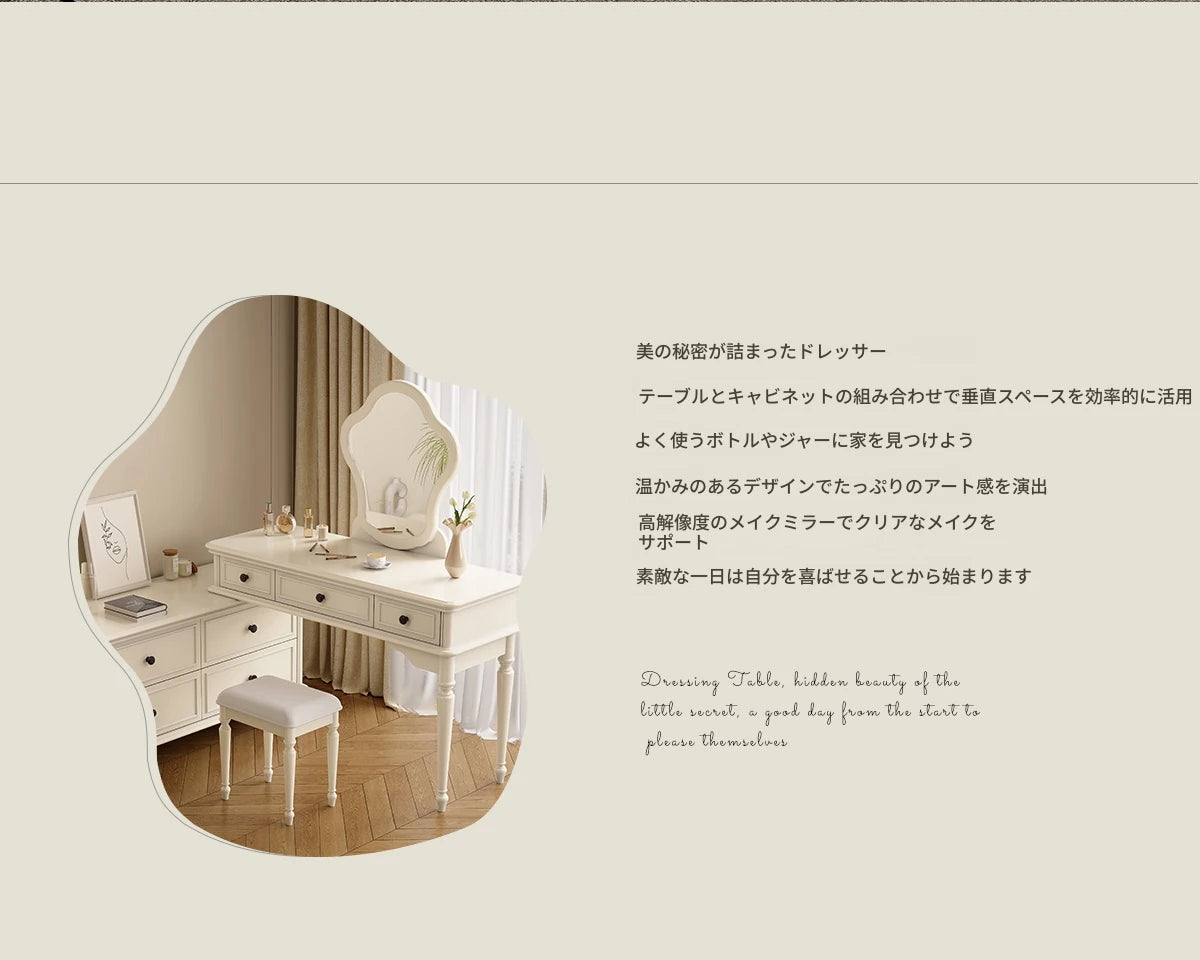 商品特徴 | このチェリー材とパインの化粧台は、温かみのある色合いと自然な質感が魅力で、どんなインテリアにも調和します。洗練されたデザインで、日々の美容ケアを特別な時間に変えてくれます。 高品質なガラス製ミラーを備えたこの化粧台は、あなたの美しさを引き立てます。毎朝のメイクアップが楽しくなる、理想のバニティです。 機能とスタイルを兼ね備えたこの化粧台は、収納スペースも豊富です。ドレッサーとしてだけでなく、様々な用途に利用できる万能なアイテムです。 古典的なデザインに現代的な要素を取り入れたこの化粧台は、長く愛用できる逸品です。金属の装飾パーツが、全体の高級感を引き立てます。 「匂いがない」安心の素材を使用しているため、初めてのお部屋にもすぐに馴染みます。快適な環境で、心地よいスキンケアタイムを実現します。 この化粧台は、あなたの個性を引き出す完璧な舞台です。友人を招待しても自慢できる、スタイリッシュな空間を演出します。 |