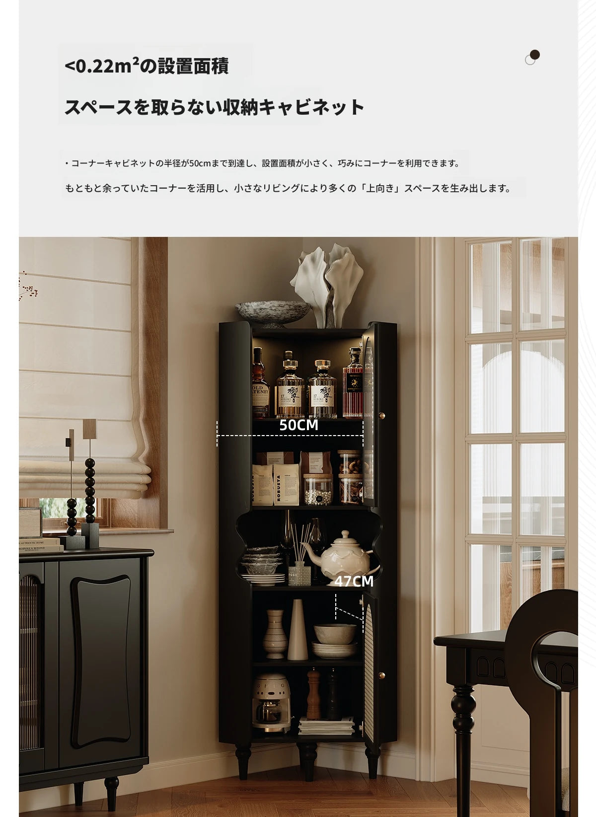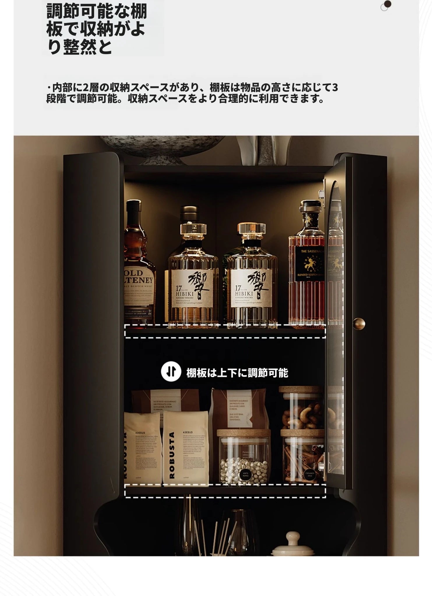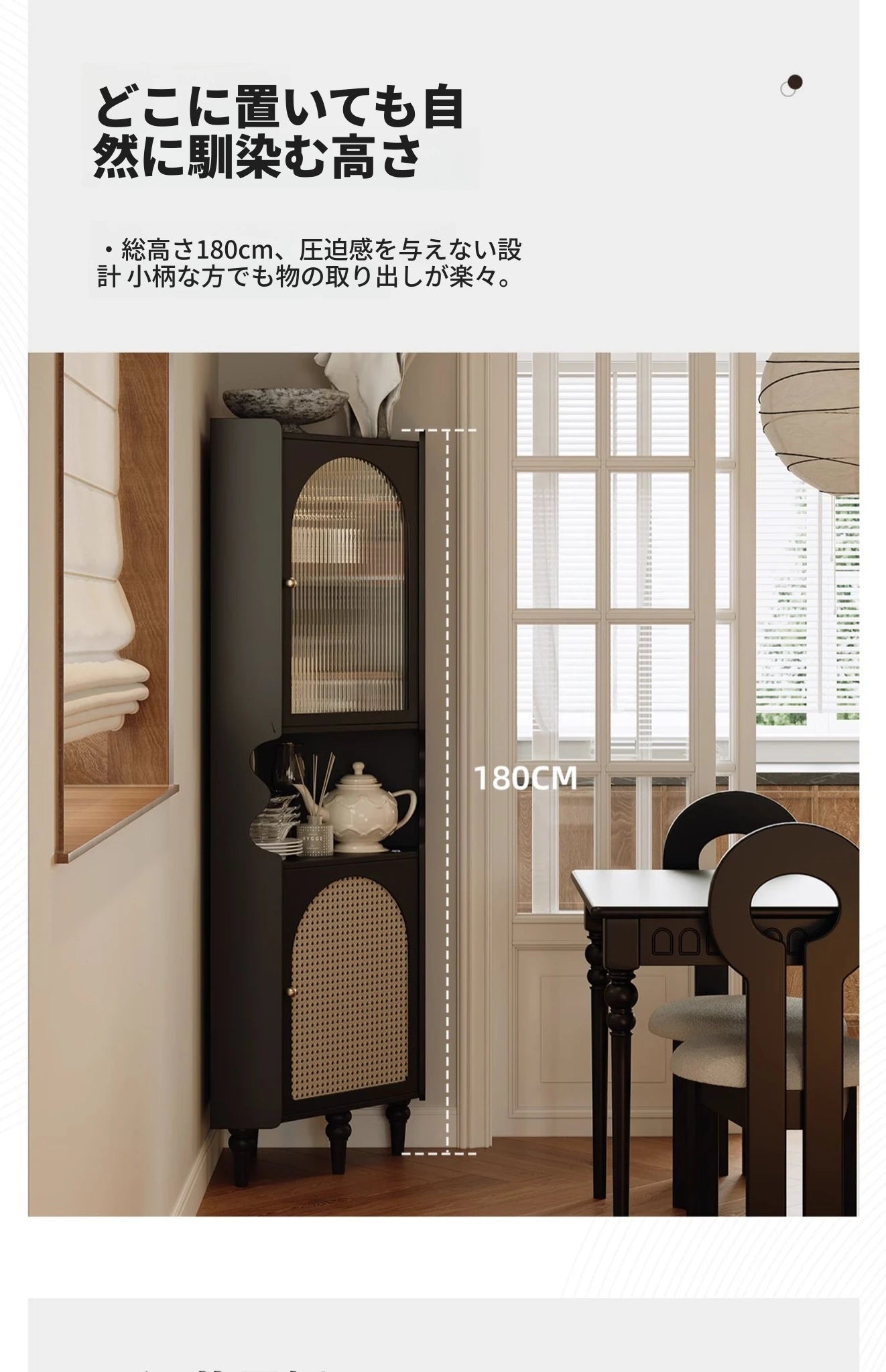 商品特徴 | このキャビネットは、集成材とアクリルの組み合わせが魅力の高品質なアイテムです。美しいデザインがどんなインテリアにも完璧にマッチします。 洗練されたラタンのディテールと、銅のアクセントが施されたキャビネット。収納力抜群で、美しい見せる収納を実現します。 ラバーウッドを使用したこのキャビネットは、環境にも優しく、耐久性が高いのが特長です。長く使えるアイテムをお探しの方にぴったりです。 上部にはグラスドアを備え、コレクションや食器を美しくディスプレイできるので、ダイニングやリビングに華やかさを添えます。 独特なデザインのこのキャビネットは、収納だけでなく、お部屋のスタイルを引き立てるアクセサリーとしてもお楽しみいただけます。 シンプルながらエレガントなデザインで、モダンな空間にもクラシックなインテリアにも調和するキャビネット。あなたの空間にぴったりのアイテムです。 |