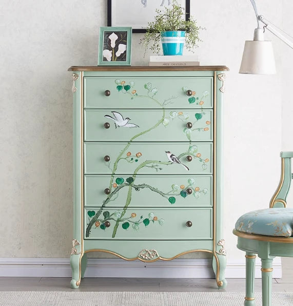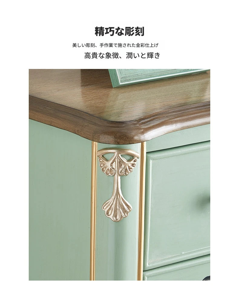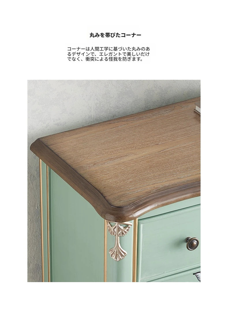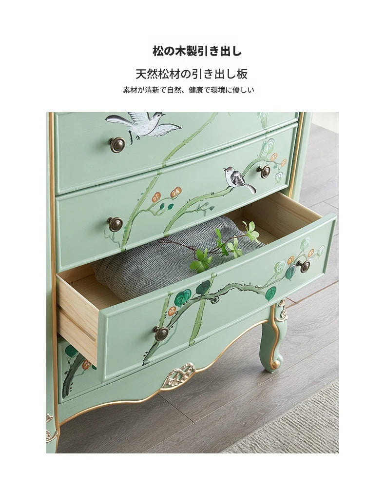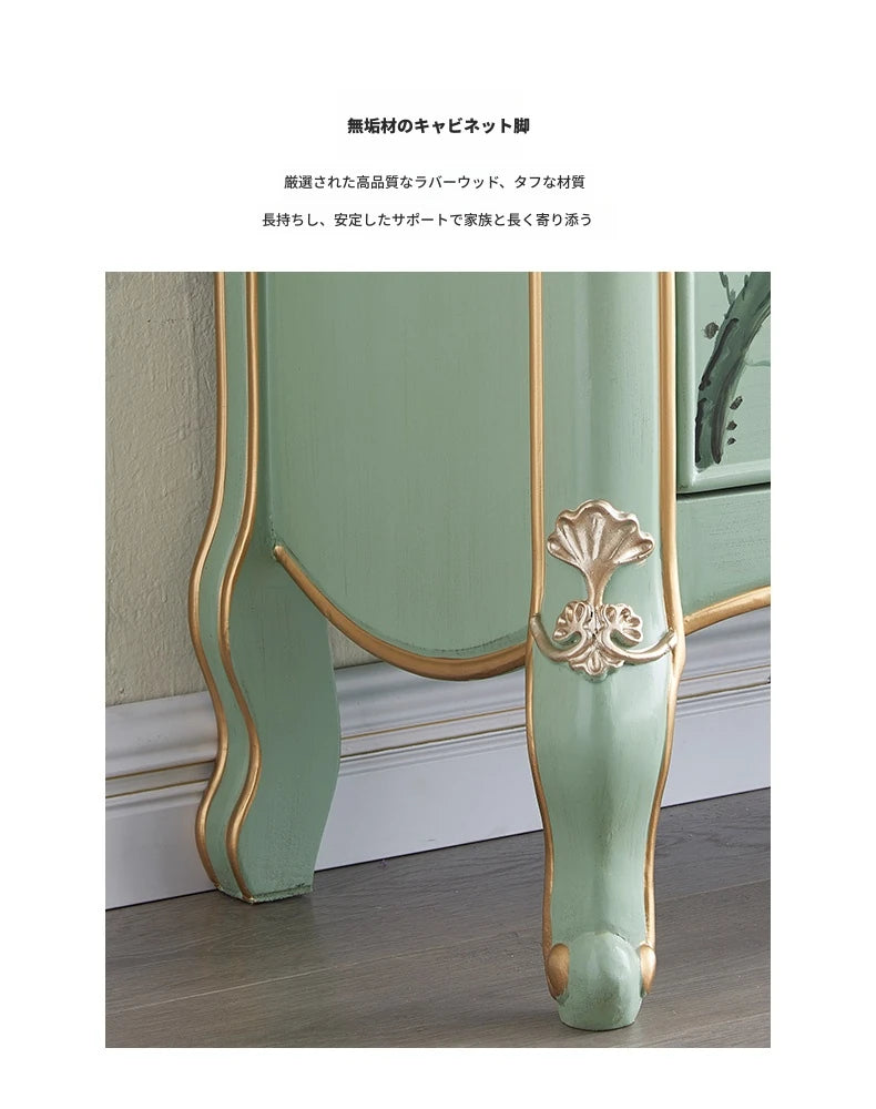 手描きの植物モチーフが施されたこのキャビネットは、ナチュラルな雰囲気を演出し、特別な空間を作り出します。