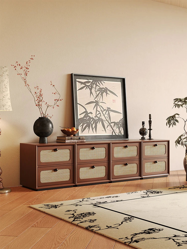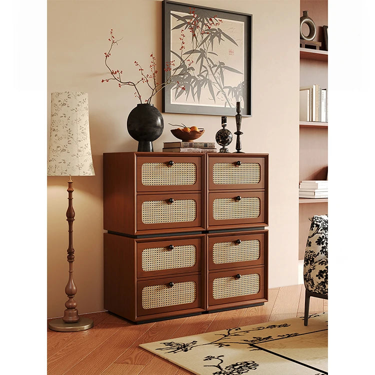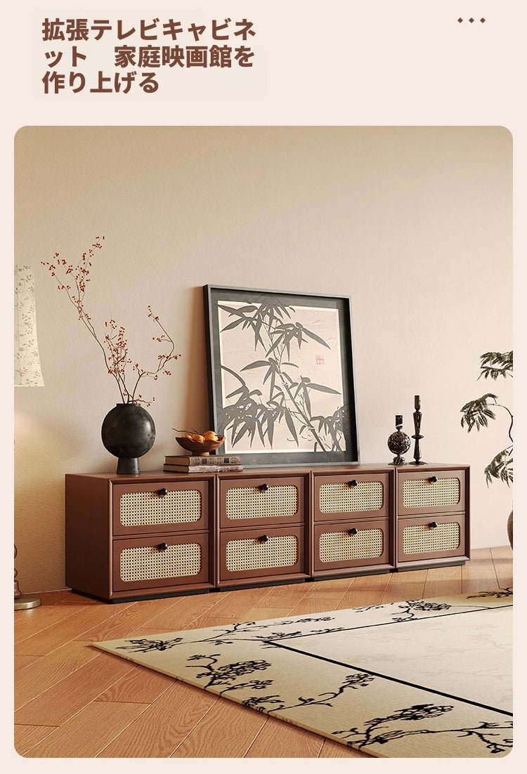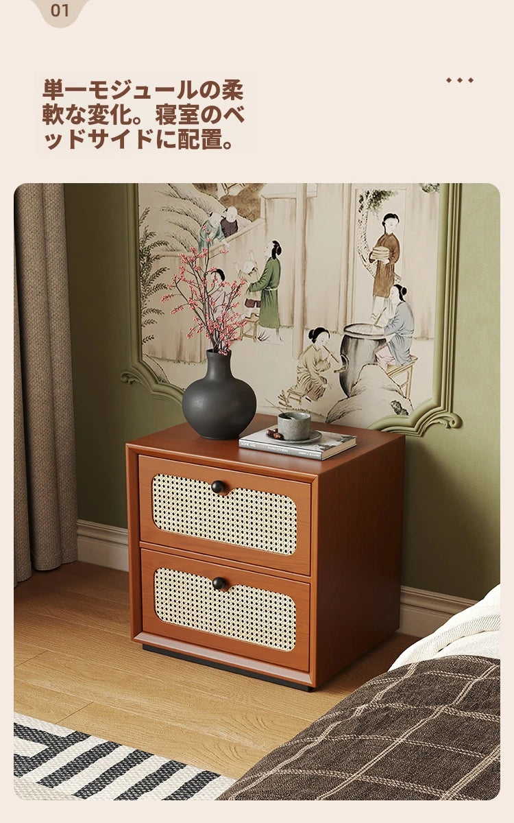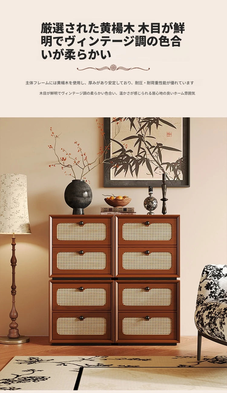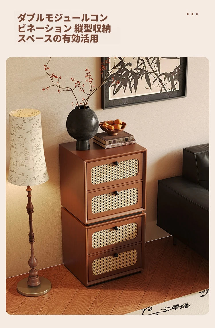 ラタンのディテールが施されたこのキャビネットは、通気性が良く、おしゃれさを引き立てます。お部屋に自然なアクセントを加え、インテリアをランクアップさせます。