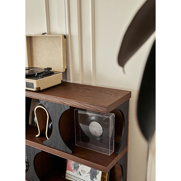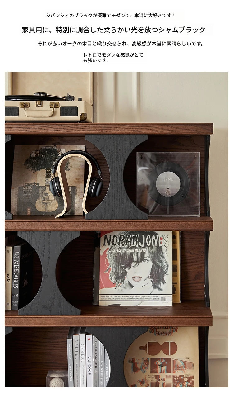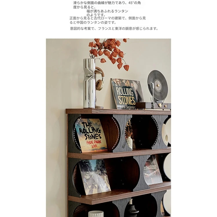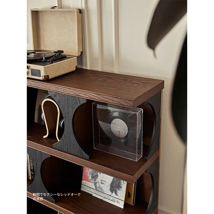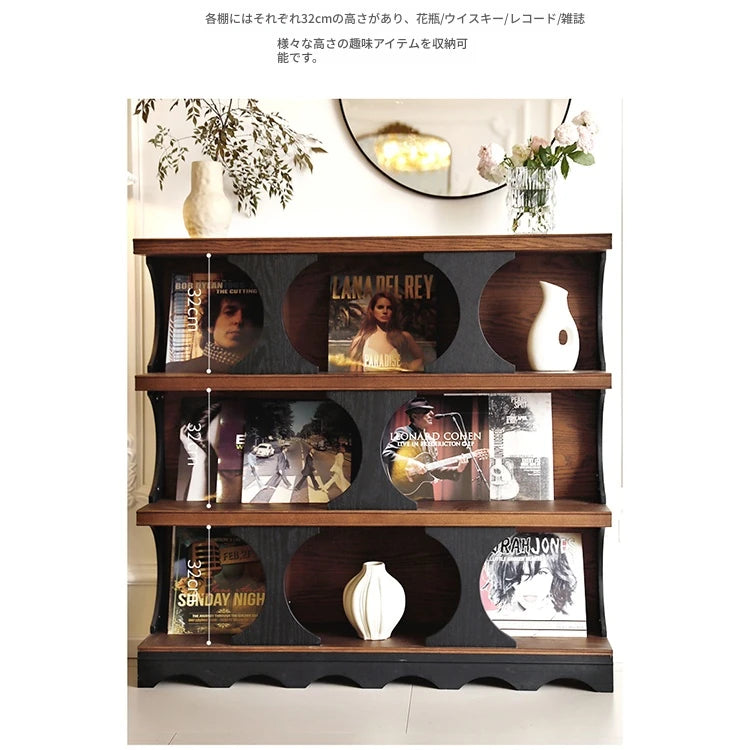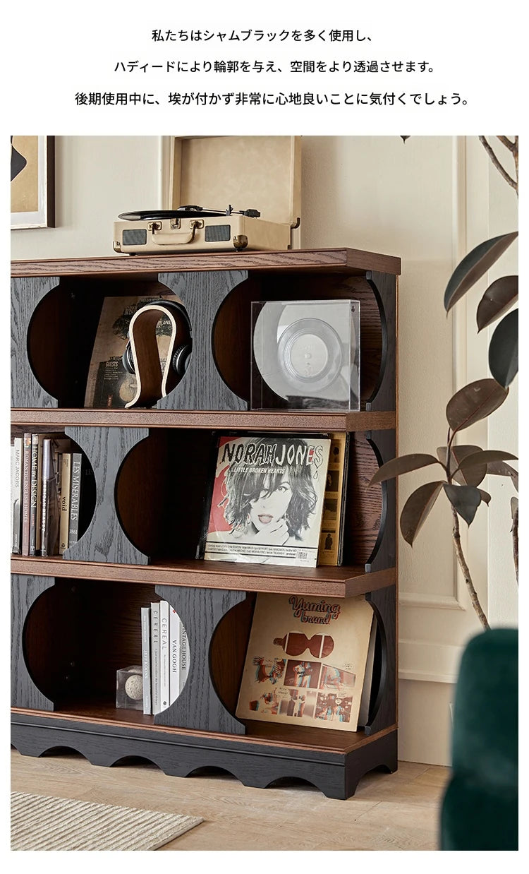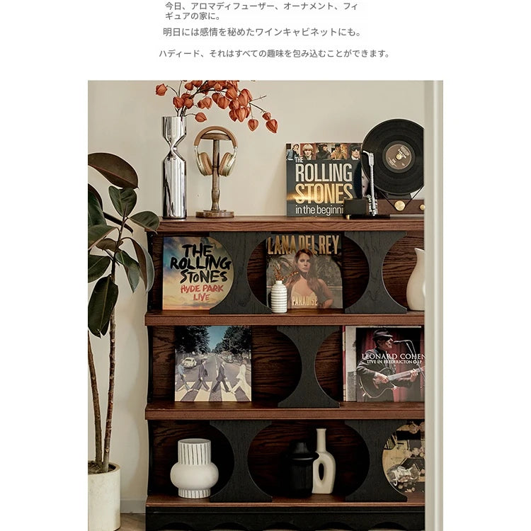 書籍やレコードを整然と収納できる多機能キャビネット。オープンシェルフのデザインで、アイテムが見やすく片付けも簡単です。