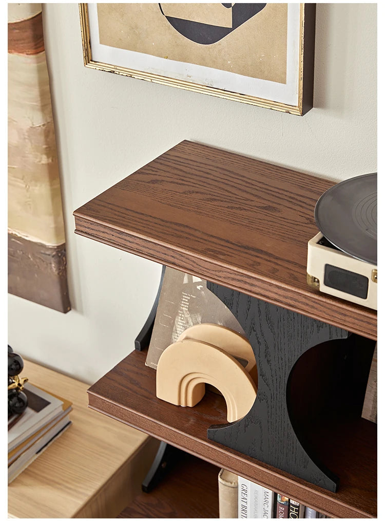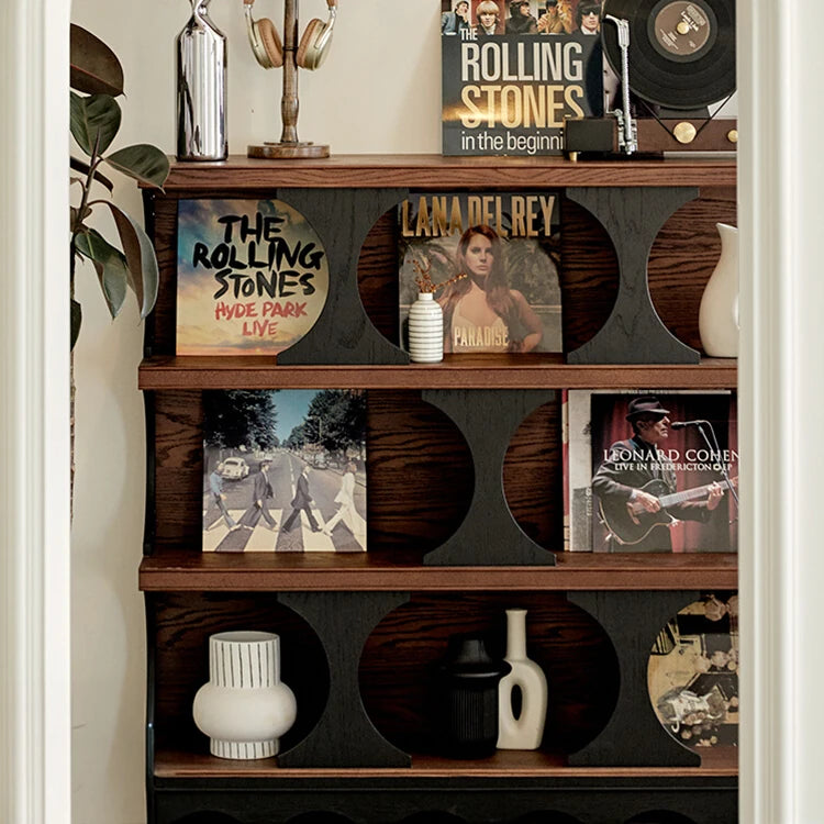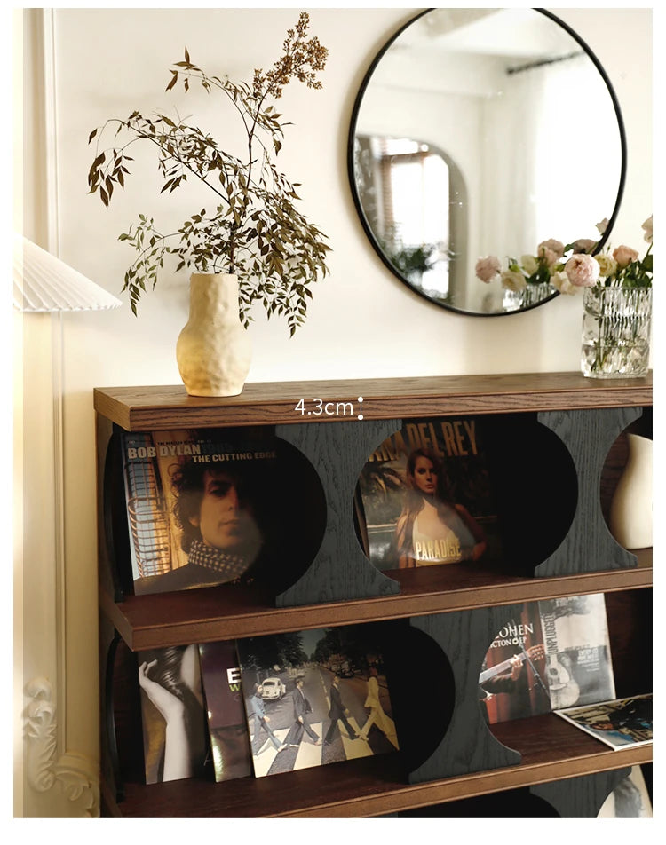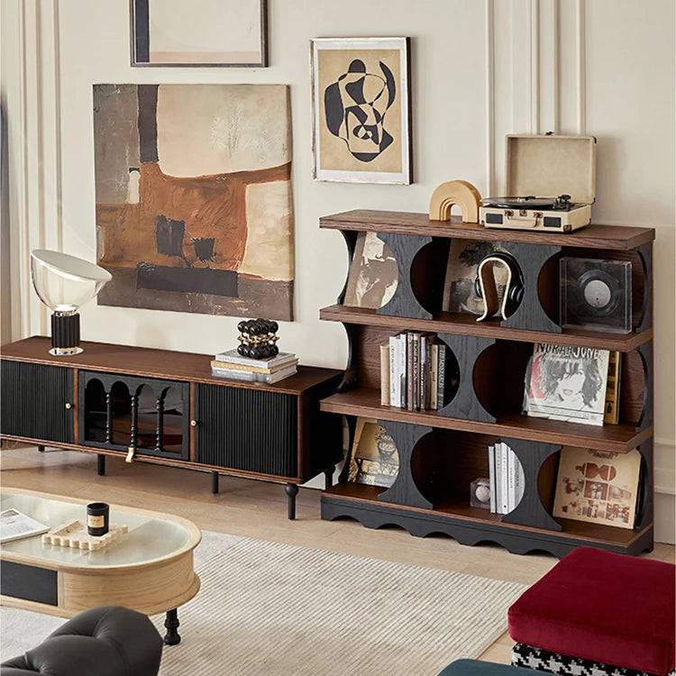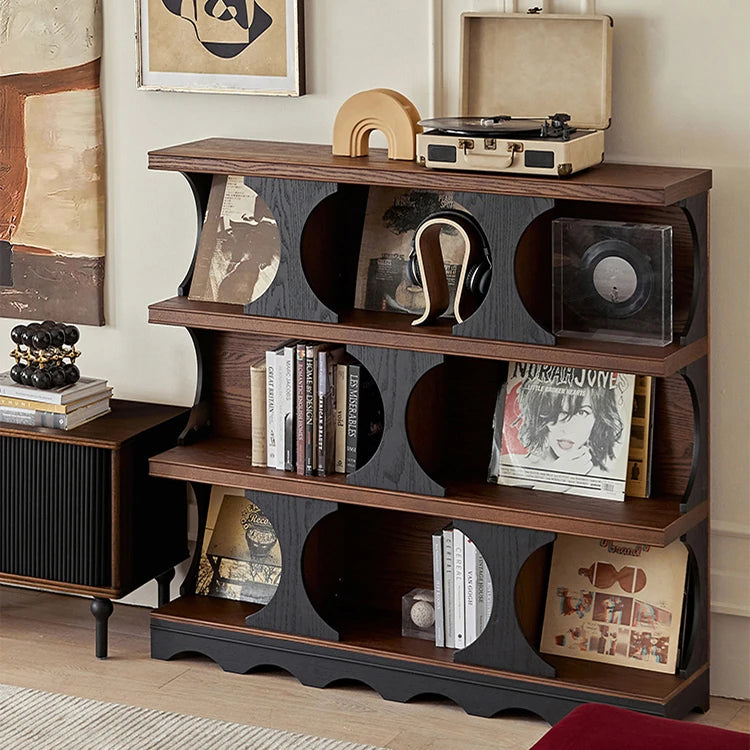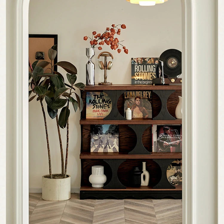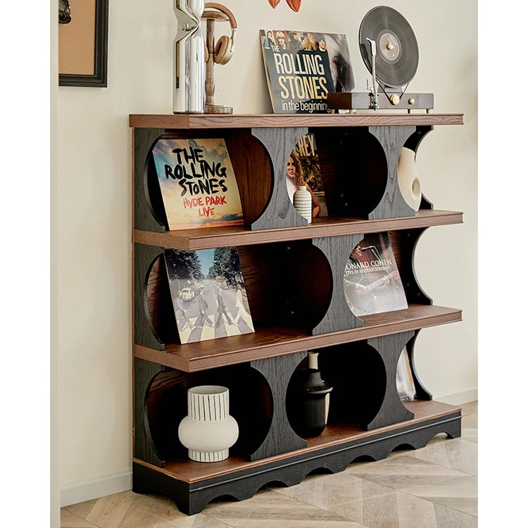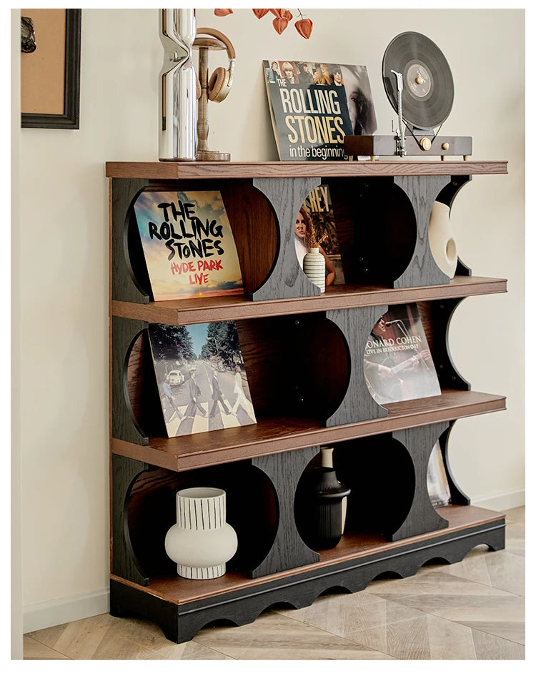 書籍やレコードを整然と収納できる多機能キャビネット。オープンシェルフのデザインで、アイテムが見やすく片付けも簡単です。