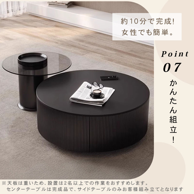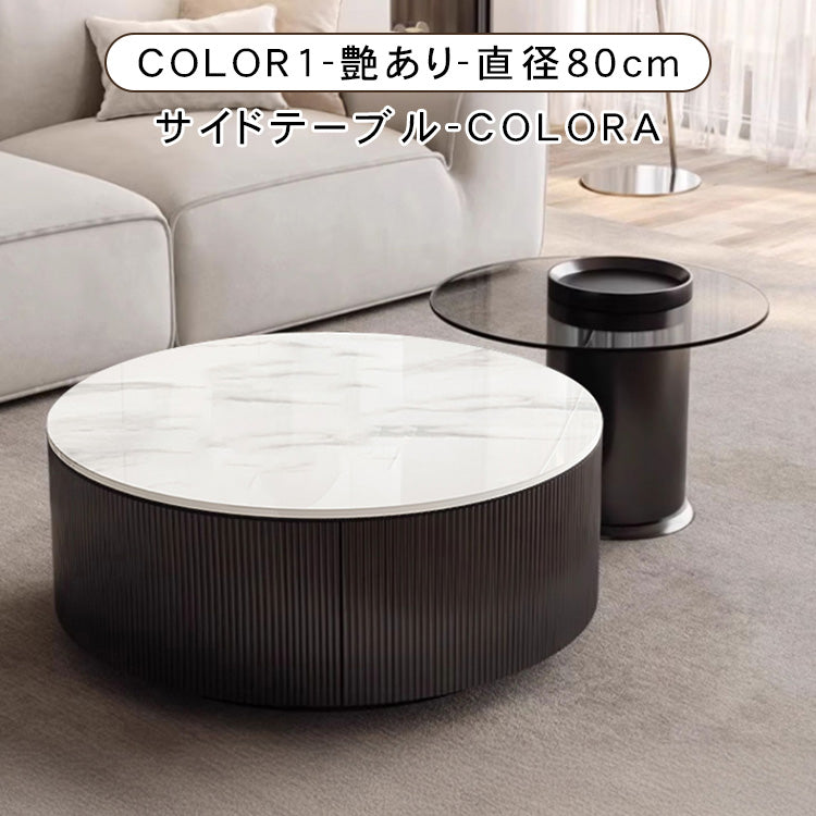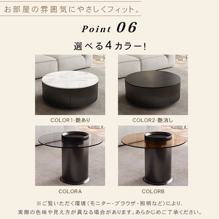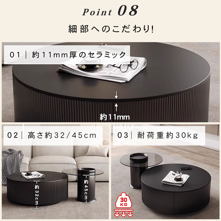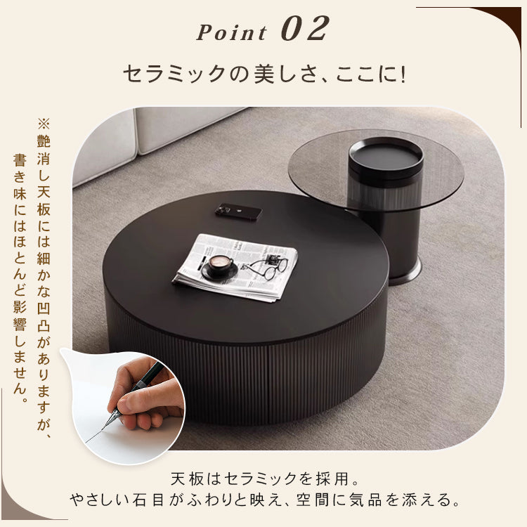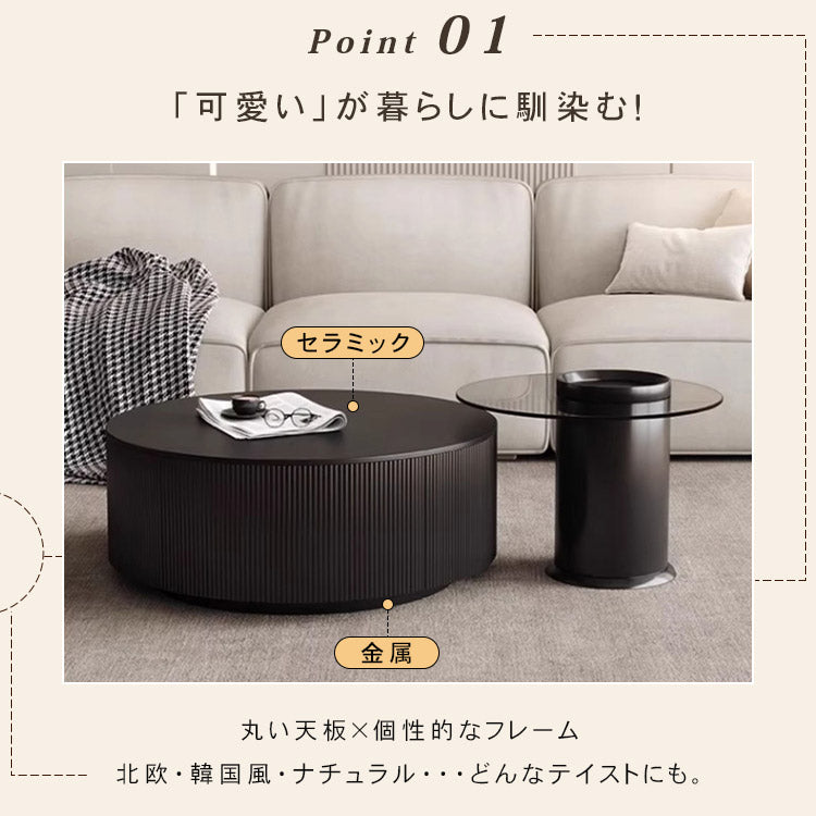 デザイナーズ リビングローテーブル セラミック風丸型×ガラス天板サイドテーブル モダンインテリア ブラック htyjj-6612