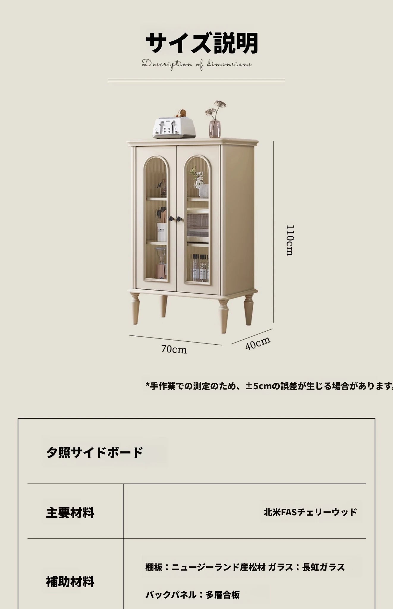 商品特徴 | 高品質なチェリー材とパインを使用したキャビネットは、温かみのある雰囲気を持つインテリアの必需品です。お部屋を美しく飾りながら、実用性も抜群です。 多層板とガラスの扉デザインにより、大切なアイテムを素敵にディスプレイできます。見せる収納を楽しみたい方に最適です。 耐久性に優れた金属パーツを使用したこのキャビネットは、長年にわたってお使いいただける安心の製品です。即購入の価値あり! スタイリッシュなデザインはどんなお部屋にもマッチします。リビングや寝室、オフィスなど多様な空間で活躍します。 匂いがない設計で、安心してご使用いただけます。「家の香り」だけを感じる空間を作り出しましょう。 シンプルでありながら、存在感のあるこのキャビネットは、インテリアのアクセントとしても大活躍。ぜひお手元にどうぞ! |