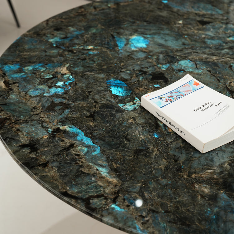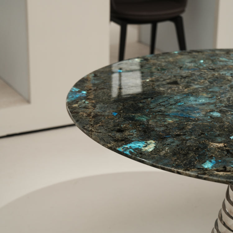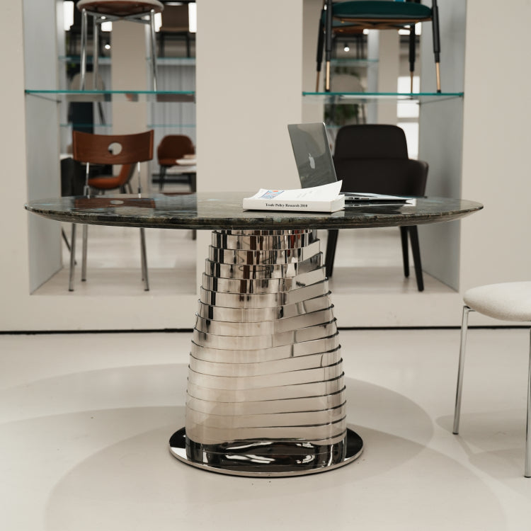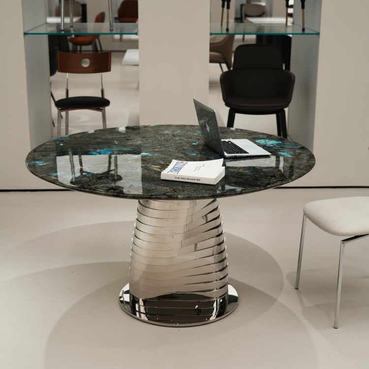 デザイナーズ 大理石ダイニングテーブル ブルーラブラドライト調 螺旋ステンレス脚 ラグジュアリーモダン jrjj-6614