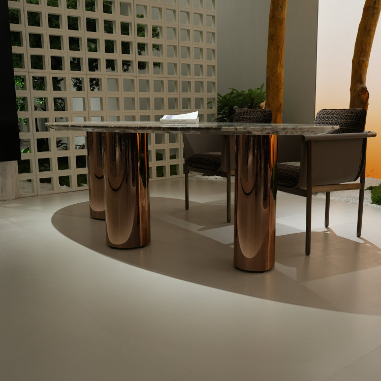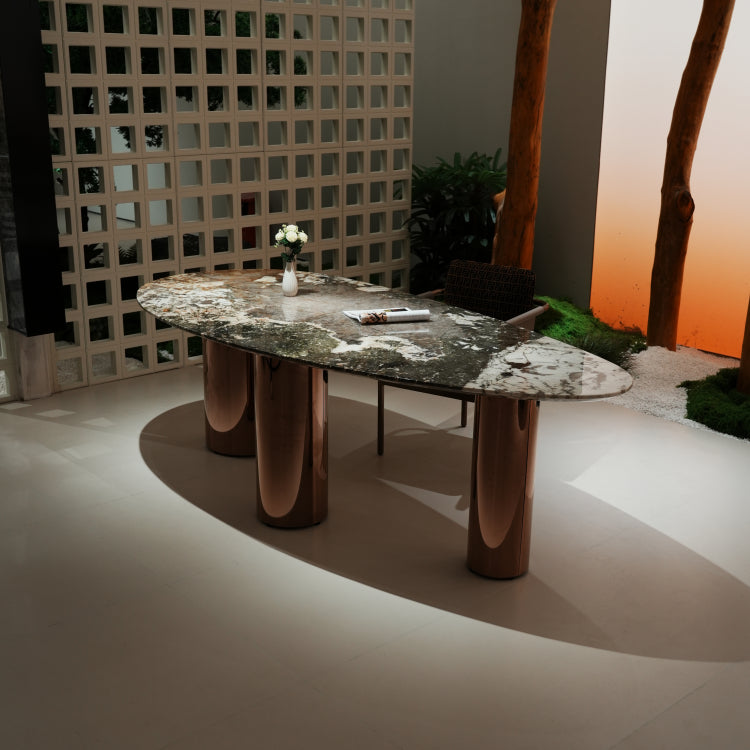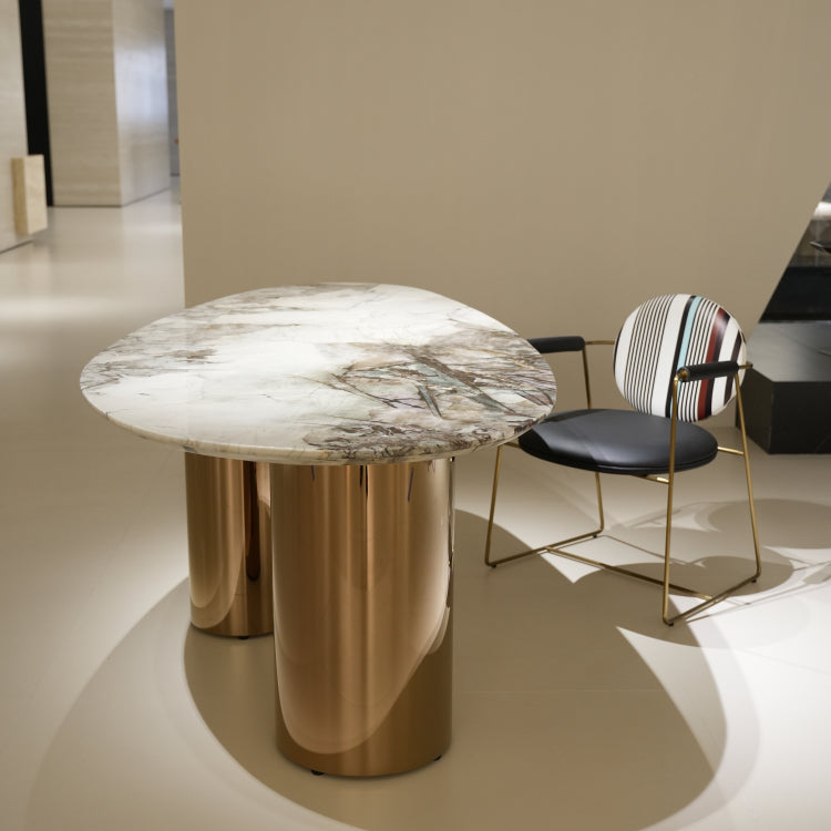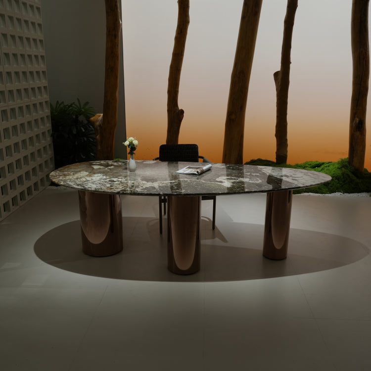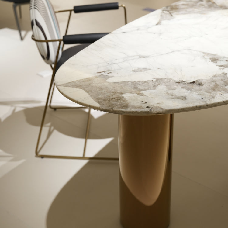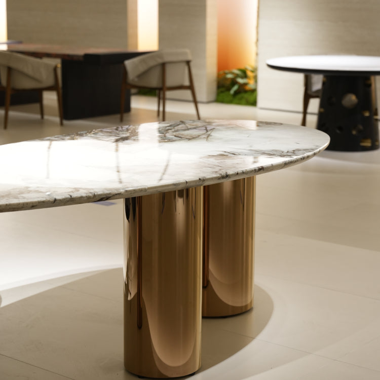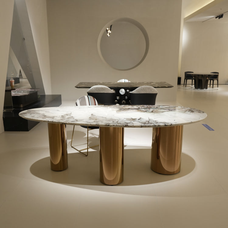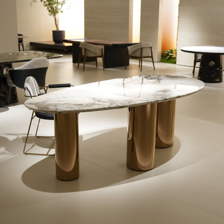 ラグジュアリー 天然大理石ダイニングテーブル アイスグレーブルー調天板 高級オーバルデザイン ゴールド脚 モダンインテリア220cm 240cm jrjj-696-kiseki